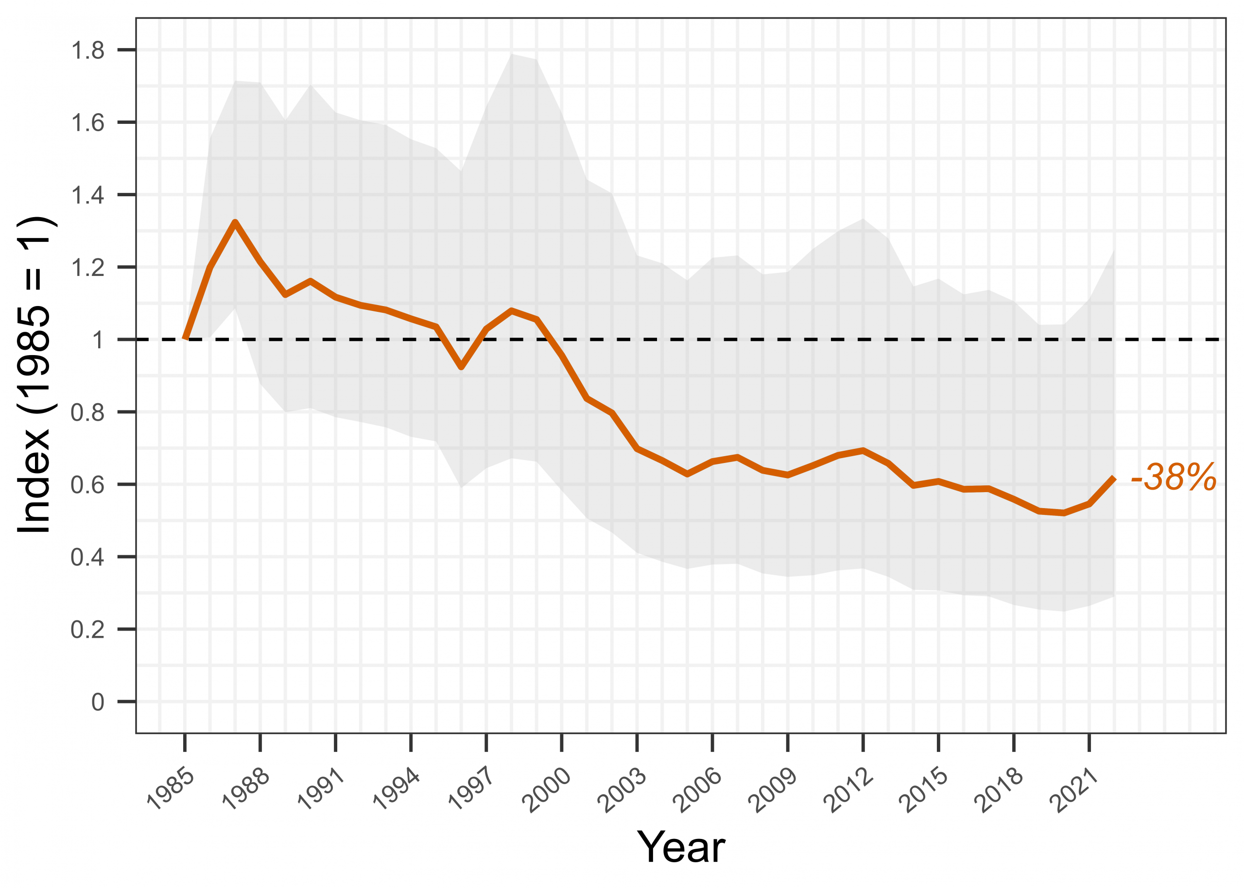 The trend for birds follows a similar shape to the main index, with an average decline in relative abundance of 56% since 1985 across the 73 taxa represented. Overall, birds have declined by an average 1.8% per annum between 2000 and 2022.